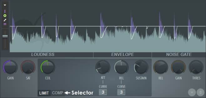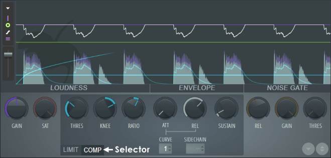 Fruity Limiter представляет собой мощный однополосный компрессорсайдчейном), лимитер и гейт. Чтобы получить доступ к соответствующим параметрам лимитера и компрессора, переключитесь между вкладками LIMIT и COMP в интерфейсе плагина (как показано ниже).