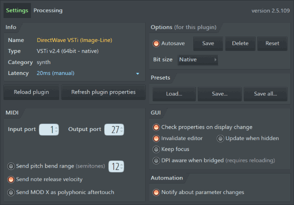 Существует родная и VST оболочка, FL Studio автоматически выбирает подходящую оболочку, в зависимости от типа загруженного плагина. Есть несколько параметров: