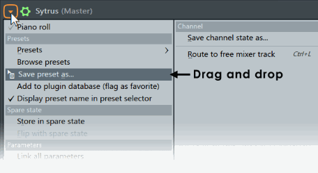 • Save presets as (сохранить пресет как) - позволяет сохранить текущий пресет как один файл в браузере. Пункт меню также можно перетаскивать на совместимые места. Например в браузер, пошаговый секвенсор или на другой экземпляр того же плагина для копирования пресета.