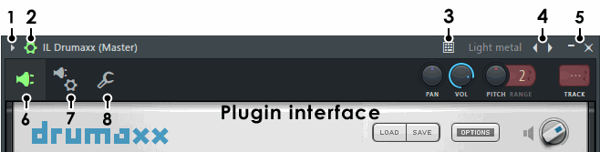Оболочка это программный интерфейс/посредник между плагином инструментом/эффектом и FL Studio. Все параметры являются общими для всех плагинов (родных FL и VST), в то время как опция плагинов (6) появляется только на оболочке VST плагинов. Оболочка обеспечивает совместимость с плагинами VST 1,2 и 3 стандартов (на скриншоте ниже демонстрируется фруктовая оболочка, содержащая VSTi-плагин Drumaxx). Для получения дополнительной информации об установке и использовании сторонних VST плагинов, нажмите здесь.