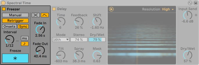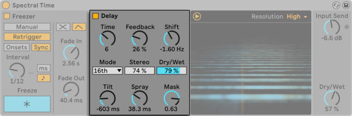 Spectral Time состоит из двух основных разделов, Freezer и Delay, которые можно использовать индивидуально или поочередно, при этом Freezer поддерживает задержку. Вы можете включать разделы с помощью кнопок Freezer On и Delay On.
