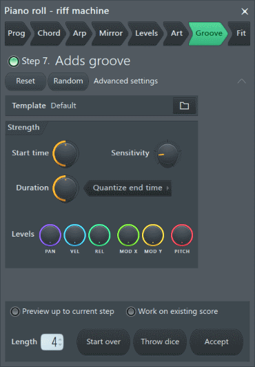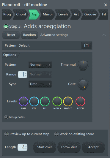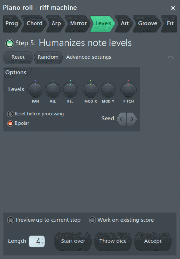 - Шаг 5. Уровни и панорамирование - рандомизация уровней параметров нот (на указанную пользователем степень), чтобы добавить вариации.