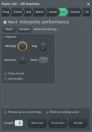 - Work on existing score (работать с существующей партитурой) — применяет настройки к нотам в пианоролле, которые были до запуска генератора рифов.