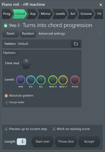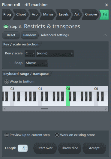 Прогрессия длинных нот по меньшей мере 8 тактов, обеспечивающие максимальный эффект последующим шагам. Чтобы задать собственную прогрессию, перед открытием риф машины введите в пианоролл ноты и включите опцию Work on existing score (работать с существующими нотами) в нижней части окна. Этот шаг можно исключить из генератора рифов, выключив переключатель.