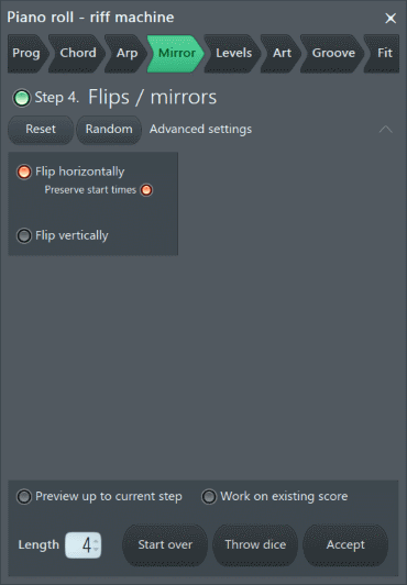 - Preview up to current step (предпрослушать до текущего шага) — проигрывает рифф, сгенерированный настройками, до и включая текущую вкладку.