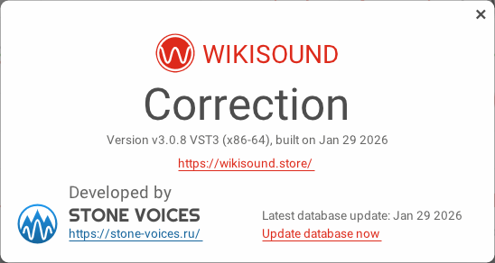 - Update Database (обновить базу данных) - выберите, чтобы проверить обновления заводских пресетов. При обнаружении новой версии база будет обновлена, и для того чтобы новые пресеты появились в списке необходимо перезагрузить плагин, удалите плагин и загрузите его завново.