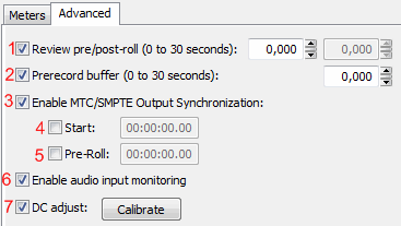 1. Revirew pre/post-roll - введите число секунд, в течение которых программа Sound Forge будет проигрывать файл до и после новой записи. Эта возможность позволяет вам приготовиться к началу записи и услышать, насколько гладким получился переход от новой записи к старой. После нажатия кнопки Record, вы услышите часть старого материала перед началом новой записи;