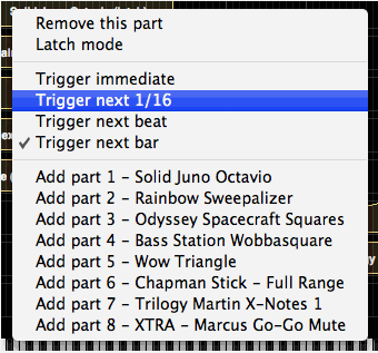 Чтобы добавить Часть, щелкните правой кнопкой мыши, удерживая клавишу Control на Ряде в Сетке, затем выберите Часть из меню. В меню отобразятся все Патчи текущего Мультиинструмента.