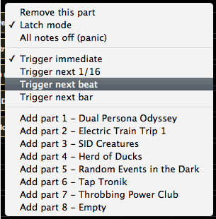 Когда выбран Режим запуска для Части, кроме режима Immediate, название выбранного Режима отображается возле названия региона Части. Чтобы выбрать или изменить Режим запуска для Части, щелкните правой кнопкой мыши, удерживая клавишу [Control] на регионе Части, и выберите Режим запуска из контекстного меню. Рядом с выбранным Режимом запуска отобразится галочка.
