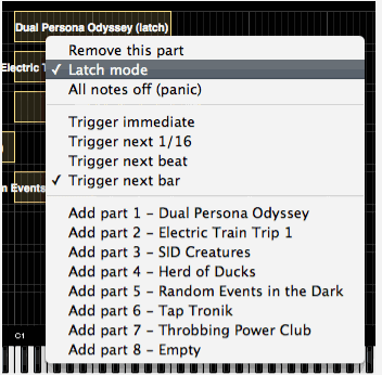 Когда режим Latch для Части активирован, нажатие на ноту будет включать/выключать эту ноту. Когда нота включена, она продолжает звучать, даже если клавиша отпущена. Нажатие на этой же ноте снова выключает эту ноту. На странице режима Stack можно получить доступ к параметрам режима Latch для Части правым щелчком мыши, удерживая клавишу [Control] на регионе Части. Чтобы активировать/деактивировать режим Latch, выберите опцию “Latch Mode” от контекстного меню.