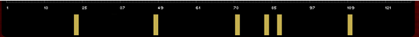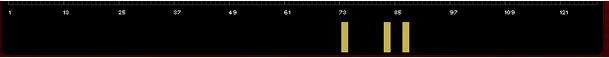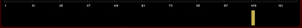При выборе способа VELO, регионы Части схематизируются на определенный диапазон силы давления на клавишу. Миниклавиатура при этом не отображается. Вместо этого горизонтальная ось отображает 128 значений Velocity. Это позволяет переключать значения Velocity и осуществлять кроссфейдинг между Частями. Например, определенная Часть будет воспроизводиться в зависимости от того, с какой силой Вы будете ударять по клавиатуре. Горизонтальная ось отображает белые номера-ссылки для значений Velocity, а также отображает сообщение о входящих MIDI нотах. Маркеры на горизонтальной оси колеблются в значениях от 1 до 127. при воспроизведении нот, их значения Velocity будут отображены желтыми вертикальными линиями.
