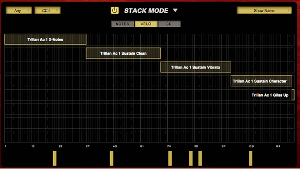 Режим STACK - мощная функция, разработанная для создания разделений, слоев, и кроссфейдинга с восемью Частями сразу. Режим STACK обеспечивает гибкую среду, как для живого выступления, так и для программирования. Режим STACK особенно полезен для записи мультичастного перфоманса, используя один единственный MIDI трек в Вашем хосте секвенсоре. Совместное использование режимов Latch и Stack позволяет создавать сложные мультичастные перфомансы, которые могут наслаиваться и квантоваться в режиме реального времени. Используйте режим STACK вместо режима LIVE, если Вы хотите создать разделения и кроссфейдинг, и воспроизводить все Части, используя один единственный MIDI канал. Есть три различных способа работы с Частями в режиме STACK: NOTES, VELOCITY, и CC. Хотя они все используют одно и то же расположение Сетки режима STACK, их применение отличается друг от друга.