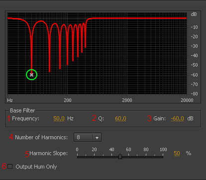 Эффект удаляет узкие полосы частот и их гармоники. Наиболее часто применяется для удаления гула электро сети от освещения и электроники. Но DeHummer также можно применять как вырезающий фильтр, который удаляет слишком резонирующие частоты из исходного звука.