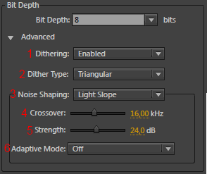- Dithering (дизеринг) - включает или выключает дизеринг при переходе на более низкую разряднсть. Если дизеринг отключен, разрядность резко усекается, производя трескающий эффект на низких уровнях громкости, который вызван искажением квантования.
